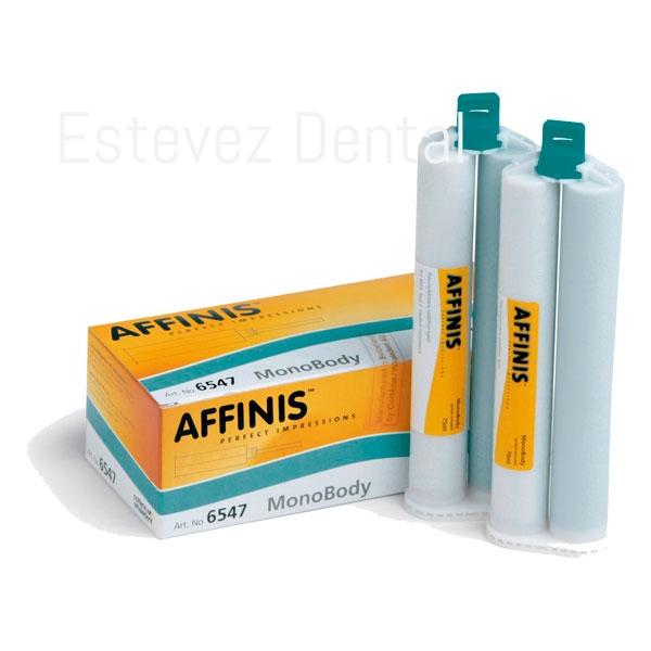 Las siliconas de impresión convencionales conducen a unos resultados insatisfactorios en condiciones clínicas de humedad debido una insuficiente fluidez y a una pobre afinidad con la superficie. El resultado es la aparición de poros por la incorporación de aire y distorsión marginal. Affinis es una silicona del tipo A pero con una afinidad a la superficie y unas propiedades ideales de viscosidad: - Su rápida y única afinidad con la estructura húmeda lo hace fluir como un hidrocoloide alcanzando las zonas más críticas sin tener que ejercer ningún tipo de presión con el material de cubeta. - La especial combinación de aditivos ejerce una mínima barrera a la viscosidad (consistencia auto-adaptante) evitando atrapar el aire pero a la vez el material es suficientemente tixotrópico para evitar el goteo fuera de la preparación.