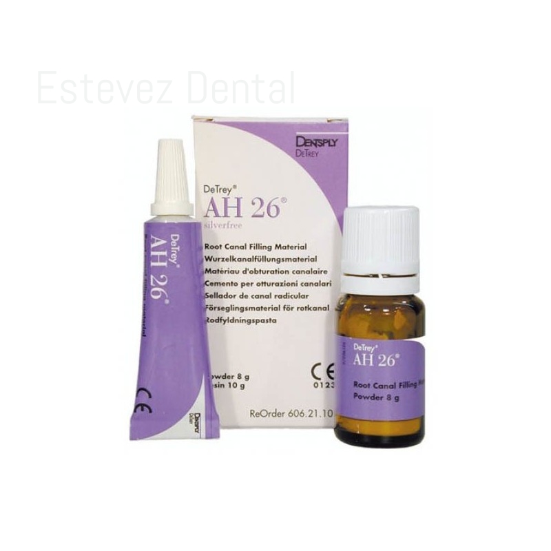 El polvo y la resina radiopaca AH 26® se mezclan para producir un material de obturación del canal radicular con excelente capacidad de sellado. Como resultado de su perfecta adaptación a las paredes del canal radicular y a su pequeña contracción durante el fraguado, AH 26 permite un sellado hermético de la obturación del canal radicular de excelente compatibilidad con los tejidos- Indicado para el sellado permanente de ápice en dentición secundaria, obturando el resto con guttapercha y en combinación con puntas de plata. Indicado para el sellado permanente de ápice en dentición secundaria, obturando el resto con guttapercha y en combinación con puntas de plata.