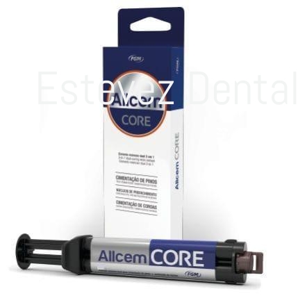 Reconstructor de muñoness autopolimerizable para la cementación de postes de fibra de vidrio, reconstrucción de muñones y cementación de la corona definitiva. Gracias a su tixotropía, allcem core no precisa de matriz metálica para la realización del muñón.
