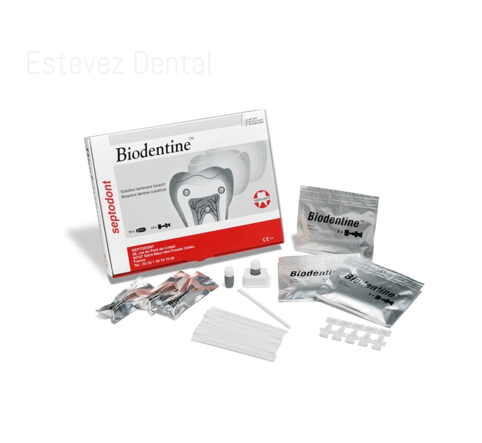 Sustituto de dentina bioactivo a base de silicato tricálcico. Biodentine es un sustituto dentinario bioactivo que posee propiedades mecánicas similares a la dentina sana y puede remplazarla tanto a nivel coronario como a nivel radicular. Contiene principalmente elementos minerales de alta pureza, exentos de monómero. Sus propiedades mecánicas y físicas permiten un funcionamiento rápido, sin tratamiento previo de la superficie de los tejidos calcificados. Biodentine proporciona las condiciones óptimas para conservar la vitalidad pulpar, garantizando la hermeticidad a nivel dentinario, la ausencia de sensibilidad post-operatoria y la perennidad de las restauraciones realizadas en dientes con pulpa viva.