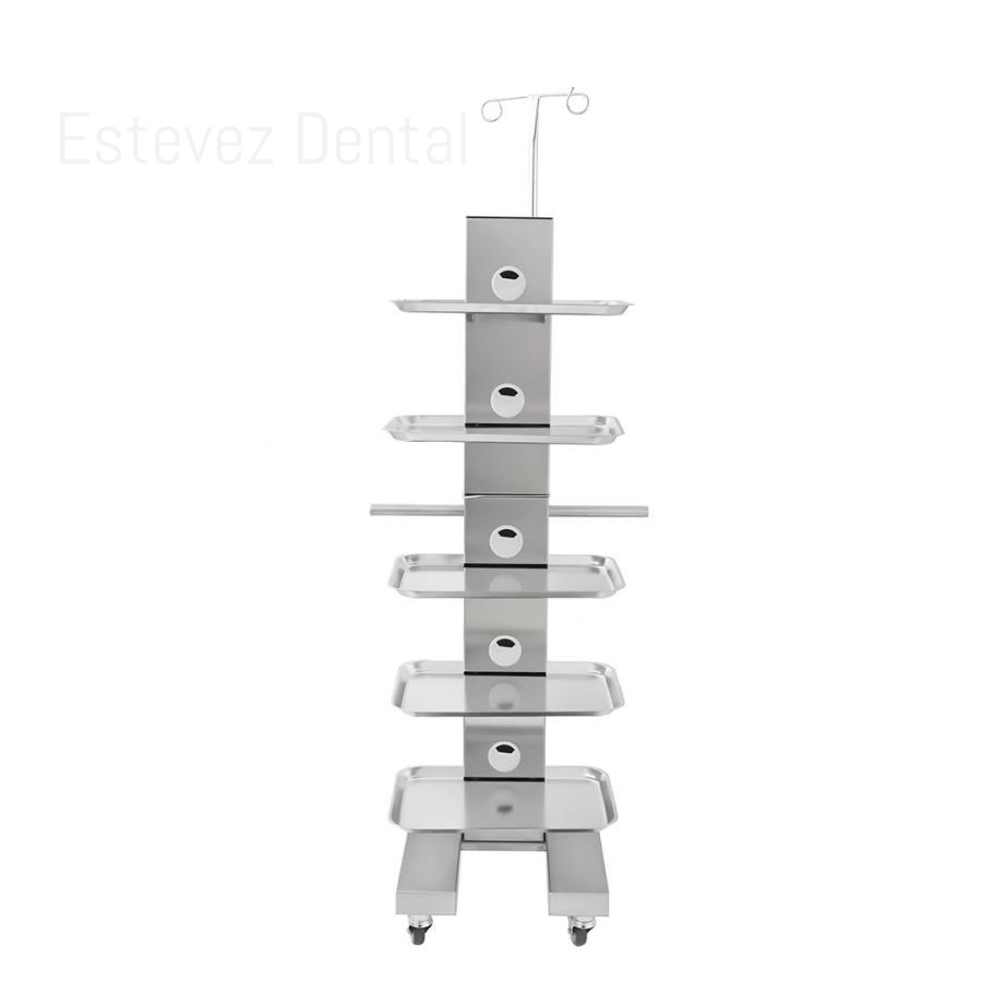 El carro para la instrumentación quirúrgica puede esterilizarse en autoclave gracias a sus cinco estantes de acero inoxidable y a los portainstrumentos de fácil extracción y lavado, que pueden montarse en un brazo frontal o lateral según las preferencias.