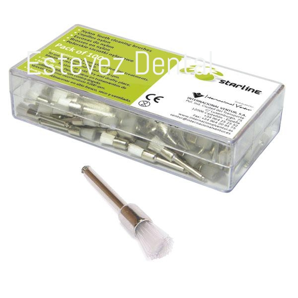 Cepillos para limpieza en tratamientos de profilaxis. Fabricados en nylon. Con contra-ángulo. Tamaño Fino. Color blanco.