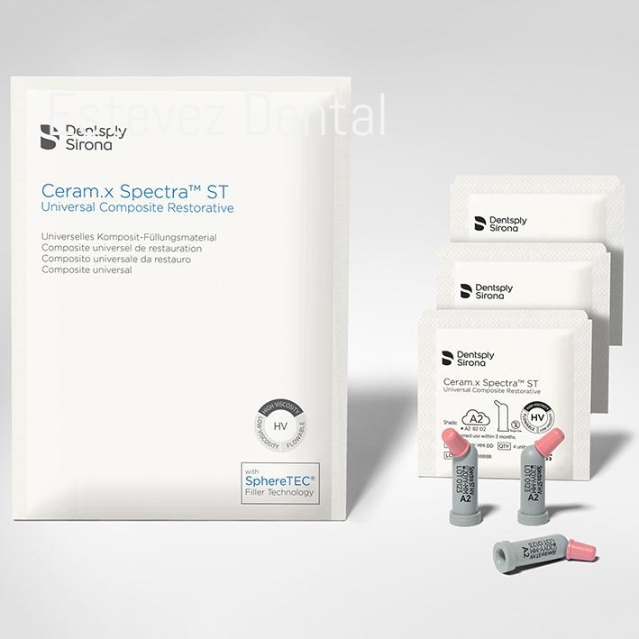 Ceram. X Universal ahora es el nuevo Ceram.X Spectra ST. Con la tecnología de relleno SphereTEC de Dentsply para seguir ofreciendo un rendimiento óptimo. Gracias a la tecnología SphereTEC, Ceram.x Spectra ST ofrece un manejo óptimo para colocarlo eficazmente ya que no se pega a los instrumentos, se adapta fácilmente a la cavidad, es fácil de esculpir y de dar forma. Con Ceram.X Spectra ST se obtienen de forma rápida resultados estéticos gracias a las propiedades camaleónicas de los colores en nube. Disponible en diferentes viscosidades: High Viscosity (HV) y Low Viscosity (LV).