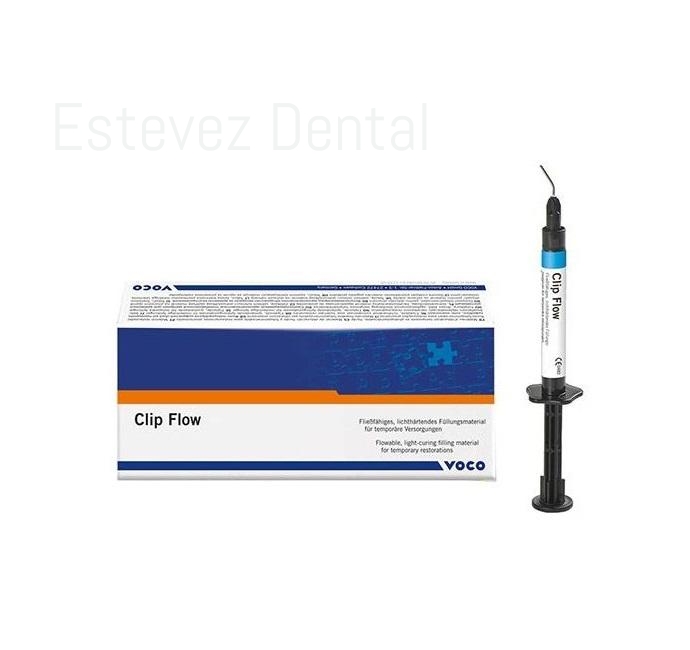CLIP FLOW Jeringa 2 x 1,8 gMaterial de obturación fluido y fotopolimerizable para restauraciones provisionales.CARACTERÍSTICAS:- Fácil de colocar fácil de retirar en una pieza- Se mantienen los márgenes de la preparación- Resistente e impermeable a la saliva- No pegajoso- Ahorra tiempo por la fotopolimerización- Elástico- FluidoINDICACIONES:- Tratamiento provisional de cavidades de inlays / onlays- Sellado de las aperturas de tornillos de implantes- Material de rebase para coronas y puentes provisionales- Material de bloqueado para zonas retentivas en la arcada, p. ej. antes de la toma de impresión- Cubrimiento del margen gingival- Fijación de matrices plásticas durante la aplicación de la obturación- Obturaciones temporales de cavidades y sellado de accesos del conducto radicularCONTENIDO:- 2 Jeringas de 1,8 g.- Accesorios