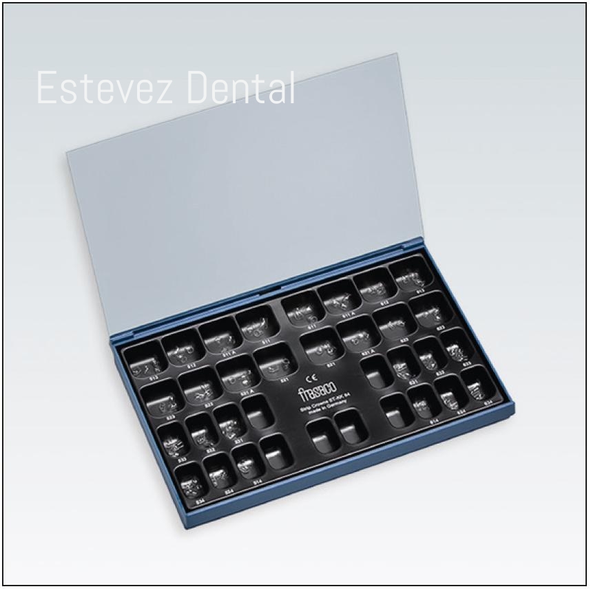 Surtido de coronas de odontopediatria 84 coronas temporales transparentes en una caja de plástico con cobertura transparente 3 coronas por tamaño en cada uno de los 28 compartimentos
