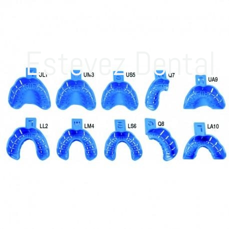 Fabricadas en plástico de alta resistencia, por lo que son rígidas e indeformables. Gracias a su diseño anatómico y a los diferentes tamaños y formas disponibles (10 alternativas), se adaptan a cualquier paciente. Tienen retención interna para evitar movimientos indeseados del alginato. Además, la base está seccionada para poder abrir ventanas fácilmente -si fuera necesario-, con una fresa y librar así los postes de implante.