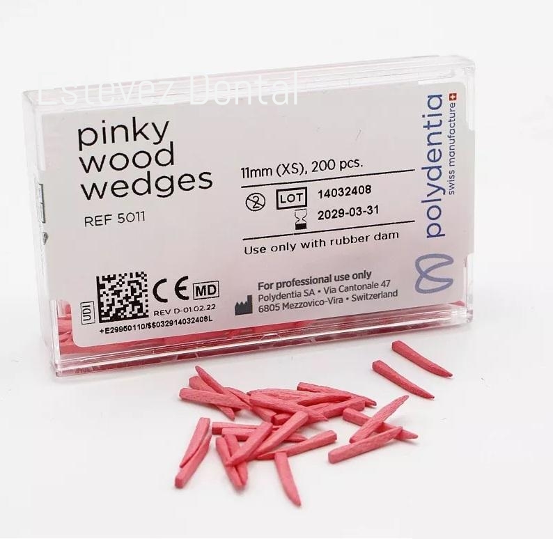 Fabricadas de madera de arce de bosques suizos de gestión sostenible, estas cuñas interdentales aseguran la adaptación óptima de la matriz en todo el margen cervical. Forma anatómica, punta redondeada.