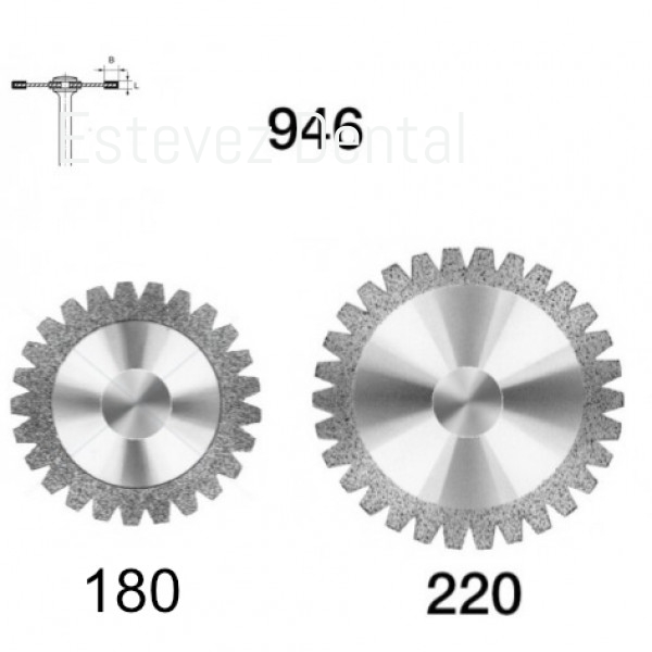 Flexible dentado con revestimiento en ambas caras. Para separar y contornear acrílicos. ISO: 806 104 365514 220 - Revolución Máxima: 20000 rpm - GRANO DENTADO Diametro: 220 - Mandril: PIEZA DE MANO - GRANO ESTANDAR Aplicación: FLEXIBLE REVESTIMIENTO AMBAS CARAS