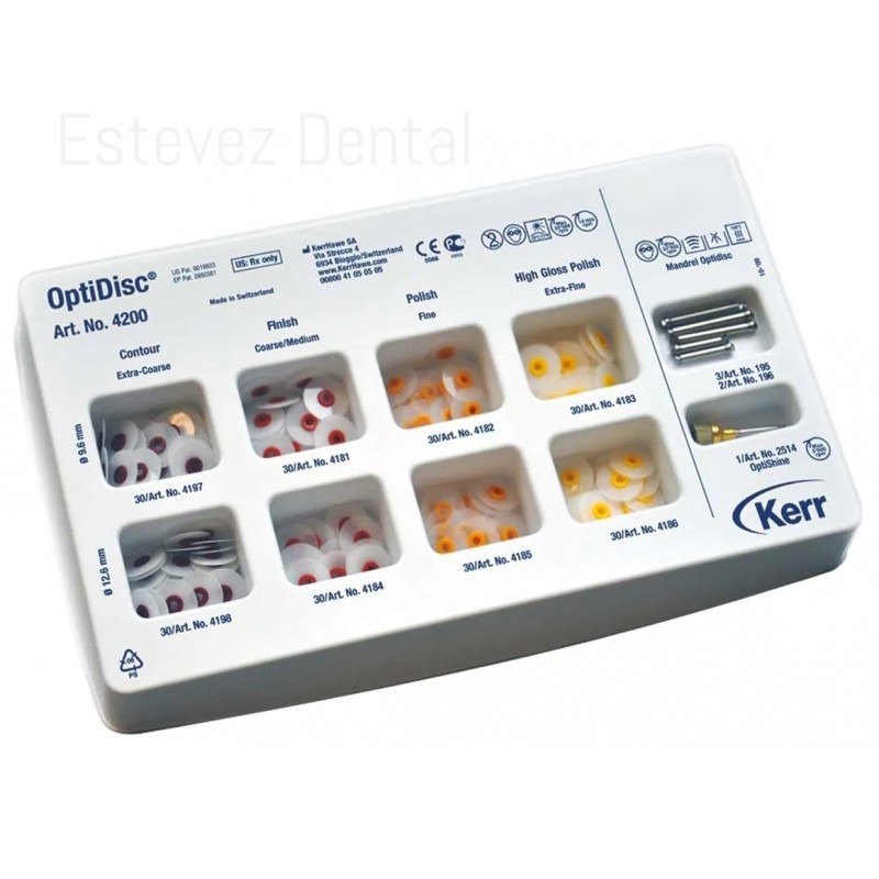 Sistema de 4 granos para contorneado, acabado, pulido y pulido de alto brillo. Para composites, ionómeros de vidrio, amalgamas, metales preciosos y semipreciosos. OptiDisc está disponible en tres diámetros diferentes, para ayudar a llegar a las áreas posteriores con facilidad sin dañar el tejido blando. El disco de alto rendimiento, ¡ahora incluso más fácil de elegir! El sistema codificado por colores permite identificar fácilmente el nivel de grano apropiado según las necesidades del procedimiento.