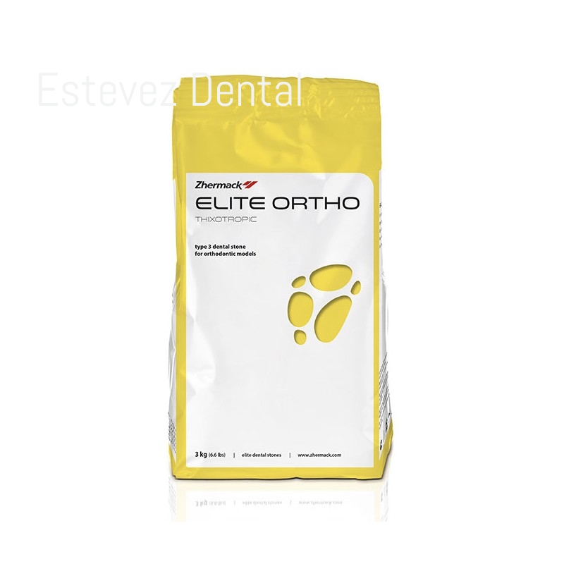 ELITE ORTHO YESO TIPO III WHITE 25 KgElite Ortho es un yeso específico para modelos de ortodoncia, blanco brillante.CARACTERÍSTICAS:- Blanco brillante- Tixotrópico- Baja expansiónVENTAJAS:- Específico para modelos de ortodoncia- Idóneo para a modelos del estudioFICHA TÉCNICA:- Aplicación: Modelo para ortodoncia- Color: White- Tipo: 3- Característica principal: Blanco brillante- Proporción agua/polvo: 24 ml / 100 g- Tiempo de mezcla (manual): 1:00- Tiempo de mezcla (al vacío): 0:30- Tiempo de trabajo: 7:00- Tiempo de fraguado: 14:00- Tiempo para retirar el modelo de la impresión: 45:00- Expansión 2 h: 0,04 %- Expansión a las 48 h: 0,05 %- Resistencia a la compresión 1 h: 32 MPa (530 kg/cm²)- Resistencia a la compresión 48 h: 60 MPa (826 kg/cm²)CONTENIDO:- 1 Bidón de 25 Kg