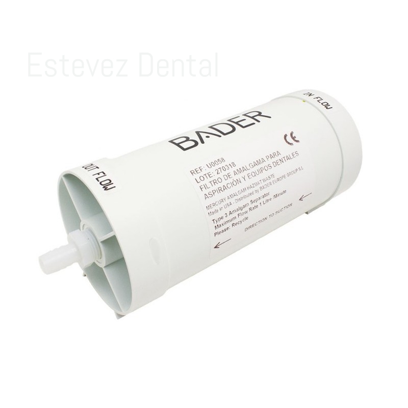 FILTRO SEPARADOR DE AMALGAMAEl separador BADER ha sido diseñado especialmente para la completa recuperación y separación del mercurio de las amalgamas dentales. El filtro de amalgama para aspiración y equipos dentales BADER supera todos los requisitos internacionales para la eliminación segura del mercurio.CARACTERÍSTICAS:- Sin componentes electrónicos- Fácil de operar y sin mantenimiento- Funcional para todo tipo de sistemas de succión- Conectado directamente a los tubos de la línea de succión- Simple y elegante- Evita la acumulación de amalgama y otros materiales restrictivos en sus tuberías y sistema de vacío- Filtro independiente para evitar el contacto con el mercurio al cambiar el filtro- Presenta un diseño flexible para aplicaciones difíciles de montar- Se puede montar horizontal o verticalmente- Es universal válido para cualquier equipo dental.para adaptarse a los diferentes sistemas de vacíoFICHA TÉCNICA:- Eficiencia de separación máxima: 99.9%- Re