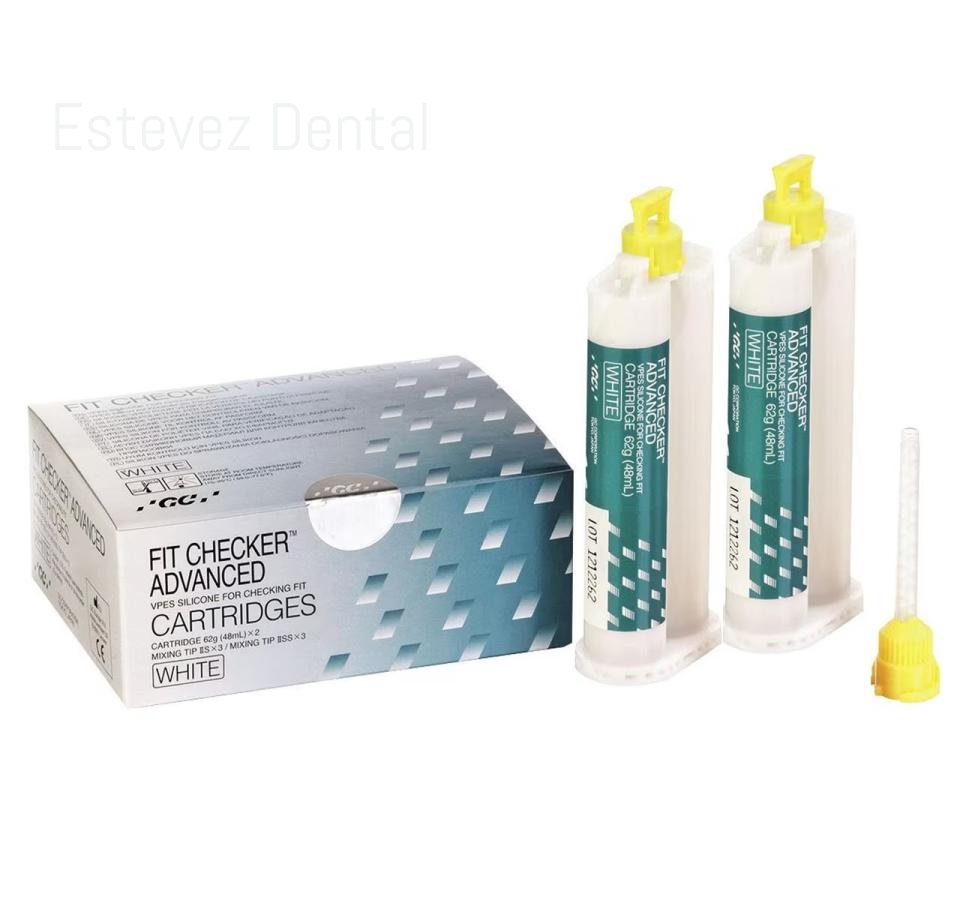Silicona VPS Blanco y Azul para comprobar los puntos de contacto y la precisión del ajuste de los trabajos protésicos. Gracias a una consistencia muy fina y a un breve tiempo de fraguado e hidrofilia, ambos materiales tienen un uso extremadamente práctico y ofrecen una identificación precisa de todo tipo de prótesis mal ajustadas. La posibilidad de escoger entre 2 colores transparentes con un buen contraste permite evaluar fácilmente cualquier tipo de prótesis: azul para restauraciones estéticas, como las coronas y puentes con base cerámica, y para comprobación oclusal; blanco, para restauraciones con base metálica y prótesis removibles. Consistencia tixotrópica con un buen flujo bajo presión Mínimo espesor de película para una colocación precisa de la restauración Gradación visible del color para identificar fácilmente los desajustes Mayor dureza para obtener un corte limpio y sencillo con fresa Elevada resistencia al desgarre para una fácil extracción Color blanco para comprobar el ajuste de las restauraciones y prótesis removibles con base metálica Fit Checker Advanced Blue: el color azul transparente permite llevar a cabo un análisis de la situación oclusal, incluso con un grosor inferior a 100 m