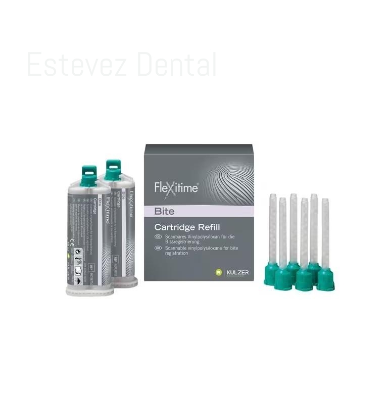 Flexitime Bite es un material VPS para registro de mordida escaneable con indicaciones multifuncionales: - Registro de mordida standard en posición de mordida final. - Cobertura de horquilla de mordida. - Material para registro de puntos para aguja. - Producción de pequeños modelos segmentados. - Datos ópticos de antagonistas reproducidos exentos de polvo para tecnología CAD/ CAM Dureza: altísima dureza final de superficie D40. Tixotrópico: no fluye de la superficie oclusal hacia los espacios interdentales. Escaneable: grabado óptico de la situación del antagonista para la fabricación de prótesis por CAD/ CAM, e.g. all- ceramic, sin el uso de polvo . Rápido: amplio tiempo de trabajo, 30s, y rápido tiempo de fraguado intraoral, 30s, confortable para el paciente. Consistencia similar a nata montada: sin resistencia a la mordida previniendo una sobredimensión en la mordedura.