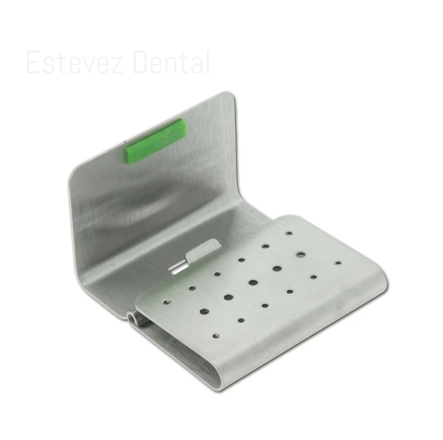 Para 12 fresas de Turbina y 5 de Contra-Ángulo.En acero inoxidable, con sistema autobloqueo para evitar la caida de las fresas. Se suministran con 4 tiras de silicona de diferentes colores para crear su propia organización de las fresas.