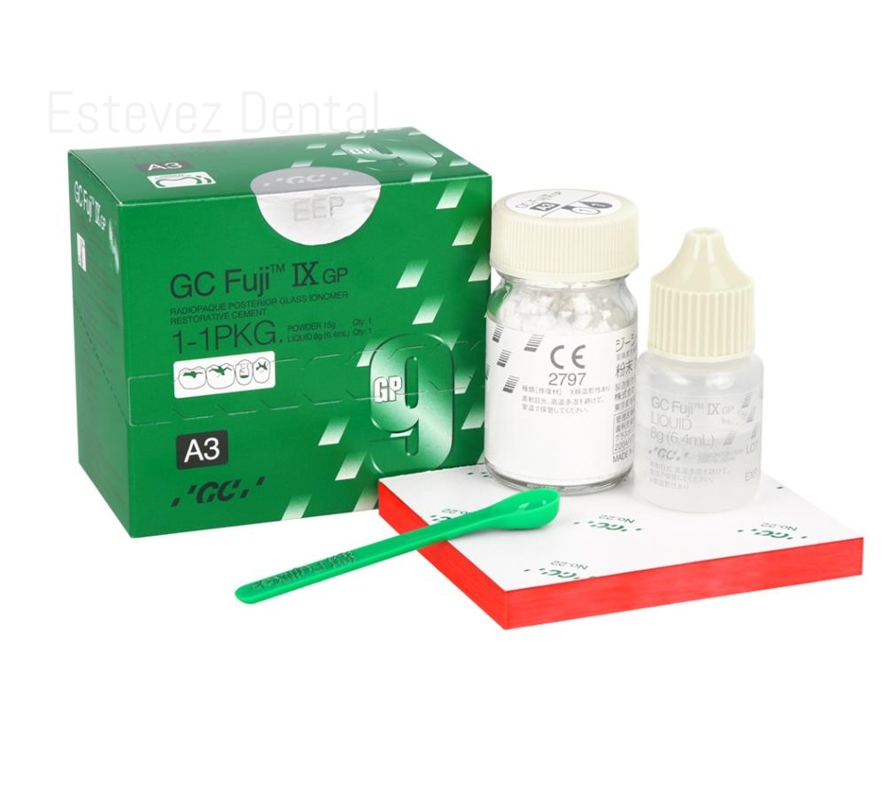 Cemento restaurador condensable de ionómero de vidrio. Fuji IX GP ha sido desarrollado en colaboración con la Organización Mundial de la Salud (OMS). Este material restaurador de posteriores, de ionómero de vidrio condensable y de simple y pronto uso, posee el doble de resistencia a la flexión que otros ionómeros de vidrio. El trabajo de acabado se puede realizar inmediatamente después del fraguado. Alta resistencia al desgaste. Campo de aplicación: Bases, reconstrucción de muñones, restauraciones de una sola superficie y como material restaurador semipermanente en restauraciones posteriores de multisuperficies. Ventajas: Material condensable con adhesión química intrínseca a dentina y esmalte, excelente bio-compatibilidad. Reducida solubilidad acuosa, alta resistencia compresiva y liberación de fluoruro.
