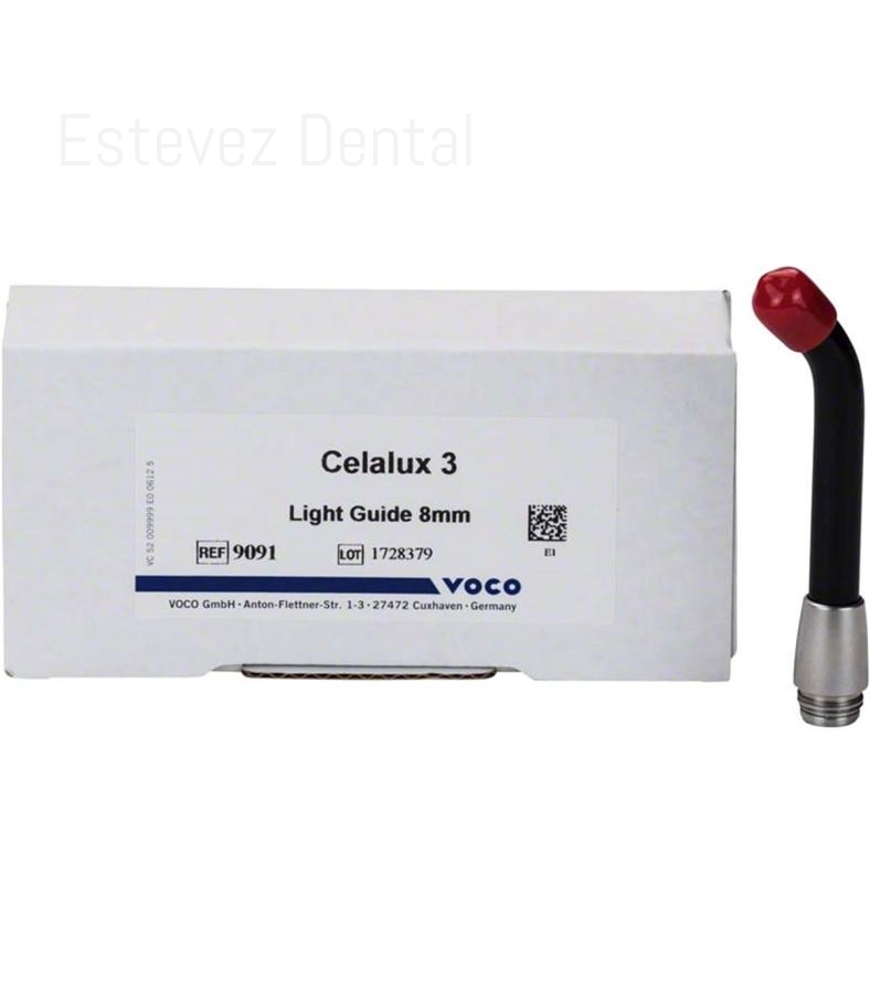 CELALUX 3 GUIA DE LUZ 8mmCARACTERÍSTICAS: - La última tecnología LED con alta intensidad de luz (aprox. 1.300 mW / cm2)- Rango de longitud de onda de 450 - 480 nm- Diseño grácil y exquisito (pen-shaped), peso de la pieza de mano inclusive cargador y guía de luz solamente 70 g- Vibración al principio, después de 10 y 20 s para una orientación temporal- Simple manipulación, inalámbrico- Guía de luz de 8 mm autoclavable- Utilizable continuamente por la batería de recambio incluida- Fácil de cambiar la bateríaINDICACIONES: - Curado de todos los materiales dentales fotopolimerizables; su polimerización se activa en un rango de longitud de onda de 450 - 480 nm