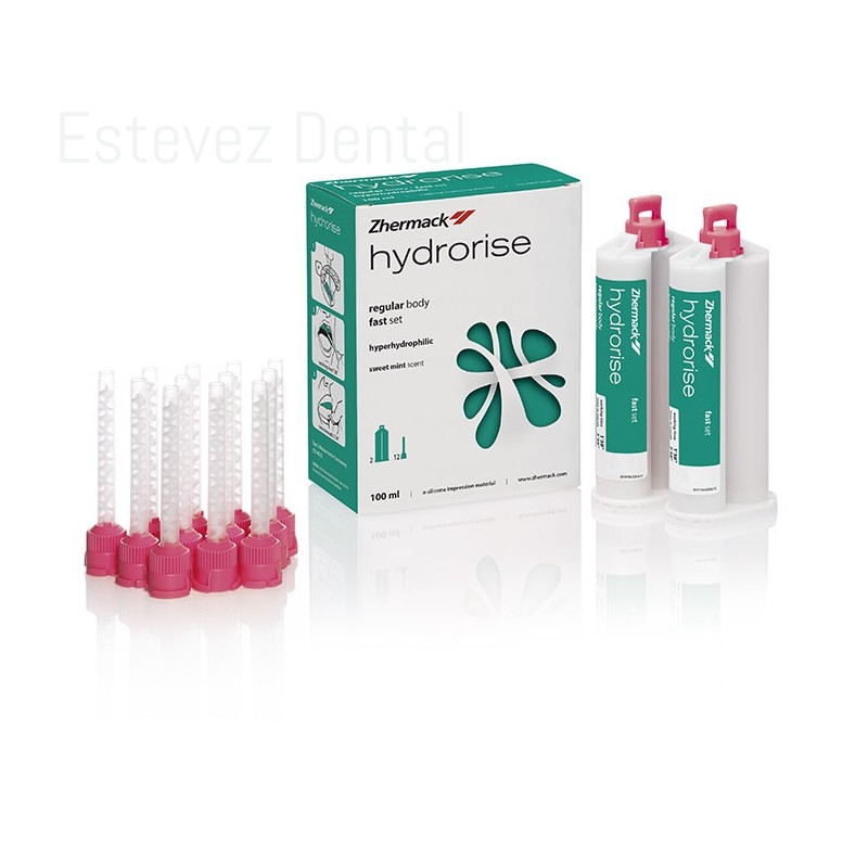 HYDRORISE REGULAR BODY NORMAL SET 2x50 mlCARACTERÍSTICAS:- Al menos el 99% de recuperación elástica- Estabilidad dimensional hasta 21 días- Resistencia al desgarro- Biocompatibilidad también en mucosa lesionada- Reproducción de detalles de hasta 5 micras- Elevada hidrocompatibilidad- Ángulo de contacto entre los mejores del mercadoVENTAJAS:- Exactitud y fiabilidad de la impresión: la recuperación elástica, cercana al 100%, y la resistencia al desgarro contribuyen a mantener la exactitud de la impresión incluso después de retirarla de la cavidad oral- Exactitud a lo largo del tiempo: la estabilidad dimensional contribuye a mantener la exactitud de la impresión hasta un máximo de 21 días- Seguridad para el paciente: biocompatibilidad incluso en mucosa lesionada para reducir el riesgo de irritación o sensibilización de la mucosa y los tejidos de la cavidad oral- Alta precisión: los fluidos de Hydrorise permiten llegar hasta las 5 micras en la repr