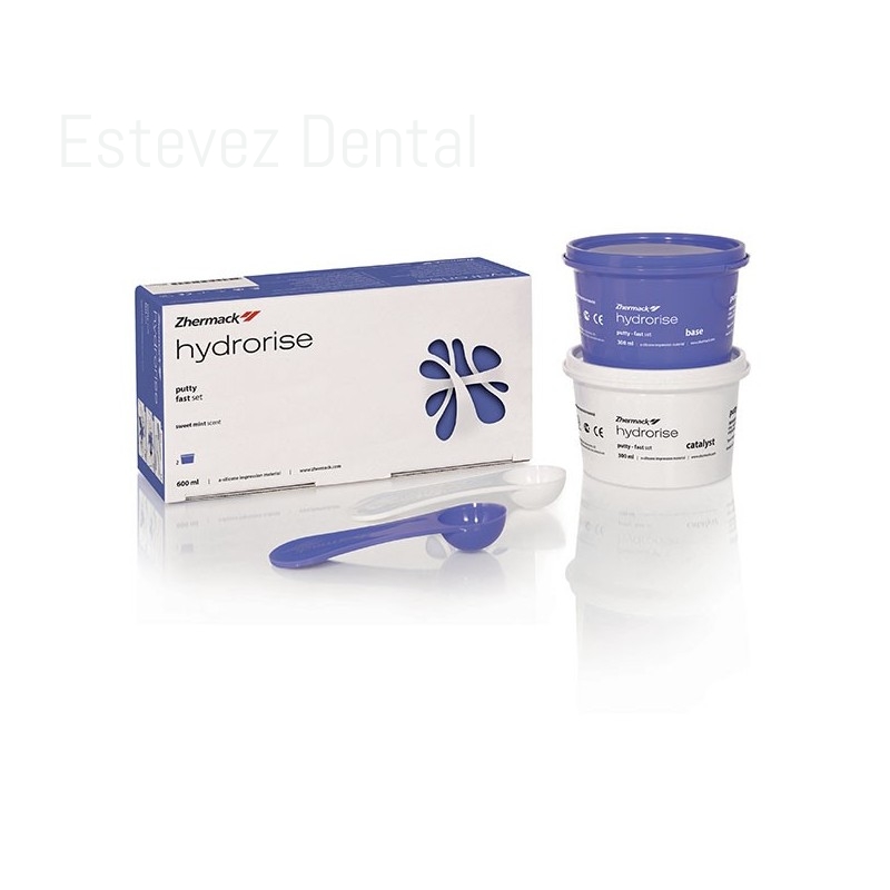 HYDRORISE PUTTY FAST SET 2 x 300 mlCARACTERÍSTICAS:- Al menos el 99% de recuperación elástica- Estabilidad dimensional hasta 21 días- Resistencia al desgarro- Biocompatibilidad también en mucosa lesionada- Reproducción de detalles de hasta 5 micras- Elevada hidrocompatibilidad- Ángulo de contacto entre los mejores del mercadoVENTAJAS:- Exactitud y fiabilidad de la impresión: la recuperación elástica, cercana al 100%, y la resistencia al desgarro contribuyen a mantener la exactitud de la impresión incluso después de retirarla de la cavidad oral- Exactitud a lo largo del tiempo: la estabilidad dimensional contribuye a mantener la exactitud de la impresión hasta un máximo de 21 días- Seguridad para el paciente: biocompatibilidad incluso en mucosa lesionada para reducir el riesgo de irritación o sensibilización de la mucosa y los tejidos de la cavidad oral- Alta precisión: los fluidos de Hydrorise permiten llegar hasta las 5 micras en la reproducci�
