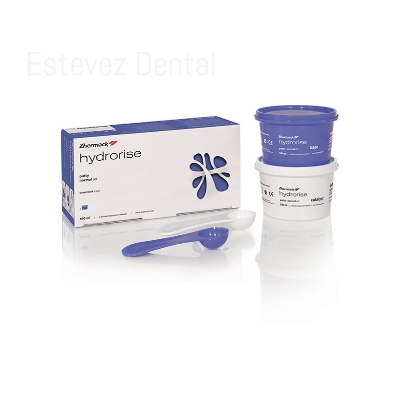 HYDRORISE PUTTY NORMAL SET 2 x 300 ml ZHERMACKCARACTERÍSTICAS:- Relación de mezcla 1:1 o 5:1 con los cartuchos de 380 ml- Relación ideal entre tiempo de trabajo/tiempo de polimerización:- Tiempo de trabajo prolongado- Menor permanencia en la cavidad oral- Biocompatibilidad- Alta hidrocompatibilidad- Tixotropía- Aroma a menta- Polimerización normal y rápida para las 6 viscosidades- Máxima precisión en la reproducción de detalles- Resistencia a la deformación- Excelente recuperación elástica- Elevada estabilidad dimensional- Menos desperdicio de material con el sistema de mezcla automática 5:1CONTENIDO:- Base 300 ml- Bote de catalizador 300 ml