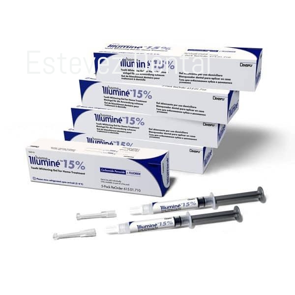 KIT ILLUMINE HOME 15%Gel para blanqueamiento dental.CARACTERÍSTICAS:- Puede usarse solo o posterior a blanqueamiento en clínica- El gel de Illumine contiene peróxido de carbamida, que ha demostrado ser lo más efectivo en blanqueamiento dental en casa- Illumine home 15% contiene 15% de peróxido de carbamida liberando H2O2 (ingrediente activo) en una concentración de 5,4% además de fluoruro de sodioCONTENIDO:5 Cajas con:- 2 Jeringas de 3 ml- 2 Puntas aplicadoras
