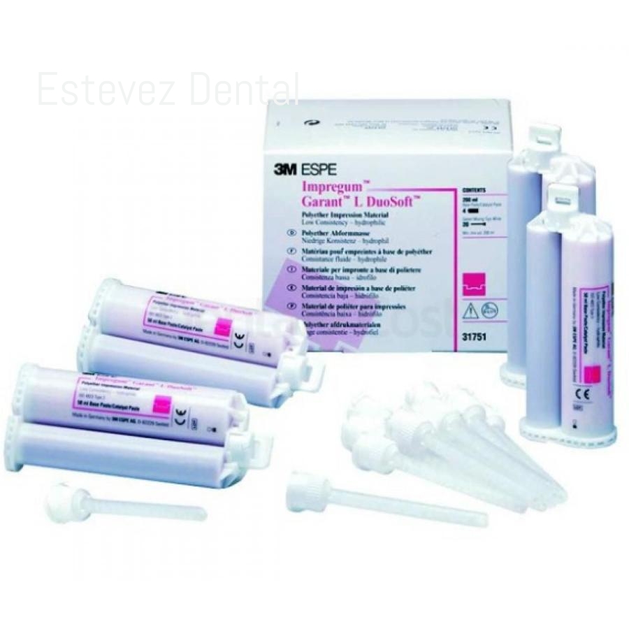 Impresiones de coronas y puentes, de Inlay y onlay, impresiones funcionales, impresiones de implantes.Recambios Impregum Garant L DuoSoft4 Cartuchos Garant - 50 ml, 20 Cánulas Blancas Garant.