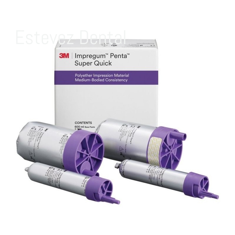 IMPREGUM PENTA SUPER QUICK MEDIUM BODYCARACTERÍSTICAS:- Poliéter superrápido con 45 segundos de tiempo de trabajo y fraguado rápido, en 2 minutos- Excelente comportamiento en presencia de humedad y muy buena fluidez- Alto nivel de precisión y reproducción de detalles, indicado para restauraciones de alta precisión- Sabor y olor a menta frescos y mejorados para ofrecer mayor comodidad al paciente- Escaneable con la generación actual de escáneres- Disponible en consistencias heavy, media y lightESPECIFICACIONES:- Material: Poliéter- Sistema de aplicación: Máquina de mezcla Pentamix- Tiempo de Fraguado: Ajuste super rápido- Tipo de impresión: Final- Viscosidad: Cuerpo mediano- Tiempo de trabajo: 45 segundosAPLICACIONES RECOMENDADAS:- Impresiones para coronas unitarias- Impresiones para implantes unitarios- Impresiones para inlays y onlays- Impresiones para puentes cortos (de hasta 3 piezas)CONTENIDO:- 2 pastas Base de 300 ml- 2 Catalizadores de 60 ml