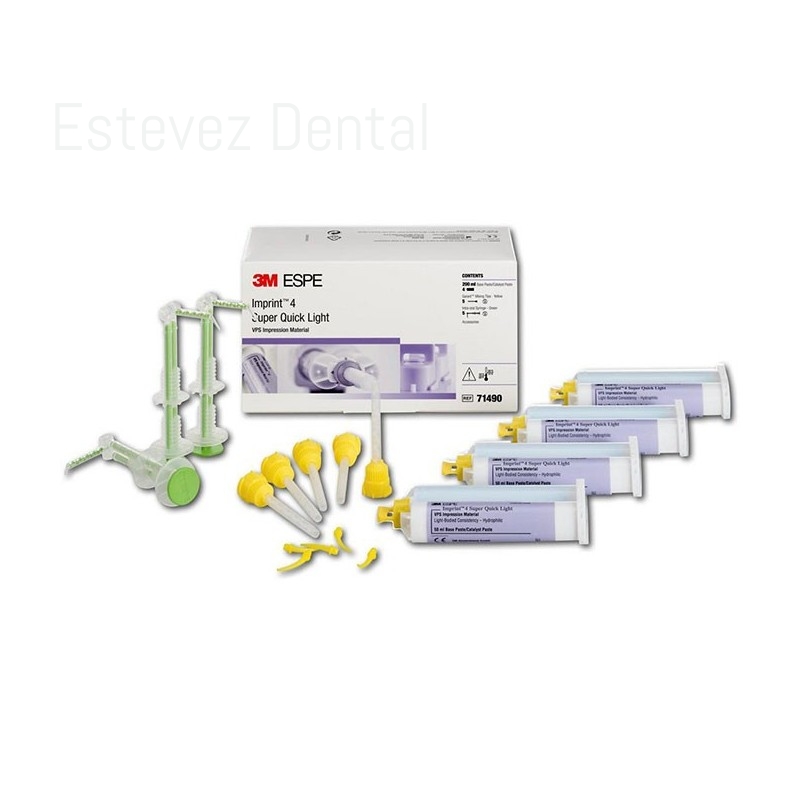 IMPRINT 4 FLUIDA LIGHT SUPER QUICK 4 x 50 mlEste innovador material de impresión de precisión de silicona A brinda resultados de impresión extraordinariamente precisos y un fraguado intraoral muy rápido. Para técnicas de uno o dos pasos con material denso y fluido. Para mezcla y dispensación automática con el dispensador Garant.CARACTERÍSTICAS:- Autocalentamiento activo que acelera el tiempo de fraguado intraoral- Suficiente tiempo de trabajo para realizar procedimientos libres de estrés- Reproducción de detalles y fluidez excepcionales gracias a su elevada hidrofilia- Colores vivos que permiten una mejor lectura- Sabor a menta para mejorar la comodidad del pacienteAPLICACIONES:- Impresiones para coronas y puentes- Impresiones para inlays y onlays- Impresiones para implantes- Impresiones para ortodonciaCONTENIDO:- 4 cartuchos Imprint 4 Light súper rápidos de 50 ml, 5 puntas de mezcla Garant amarillas, 5 jeringas intraorales 3M verdes