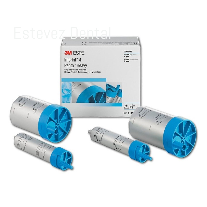 IMPRINT 4 PENTA HEAVYCARACTERÍSTICAS:- El VPS para toma de impresiones Imprint 4 le asegura a Ud. y a sus pacientes- El tiempo de fraguado intraoral más corto, para un ahorro de tiempo real- Suficiente tiempo de trabajo para un procedimiento libre de estrés- Comportamiento muy hidrofílico para un flujo excelente y una reproducción de los detalles más finos- Agradable sabor a menta para mayor comodidad del paciente- Colores vivos para facilitar la lectura del materialINDICACIONES:- Impresiones para coronas y puentes- Impresiones para inlays y onlays- Impresiones enimplantes- Impresiones en ortodonciaCONTENIDO:- 2 pastas base de 300 ml- 2 catalizadores de 60 ml
