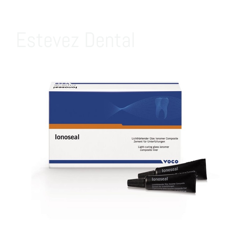 IONOSEAL TUBO 2 x 4 gComposite de ionómero de vidrio fotopolimerizable, para rellenos de base.CARACTERÍSTICAS:- Material de un componente listo para usar- Ahorro de tiempo: fotopolimerización en segundos- Aplicación rápida e higiénica- Alta resistencia compresiva (226 MPa)- Liberación de fluoruro previene caries secundaria- Alta biocompatibilidad- RadiopacoINDICACIONES:- Recubrimiento debajo de todo tipo de material de restauración- Sellado de fisuras- Restauración de pequeñas lesionesCONTENIDO:- 3 Jeringas de 2,5 ml- Accesorios
