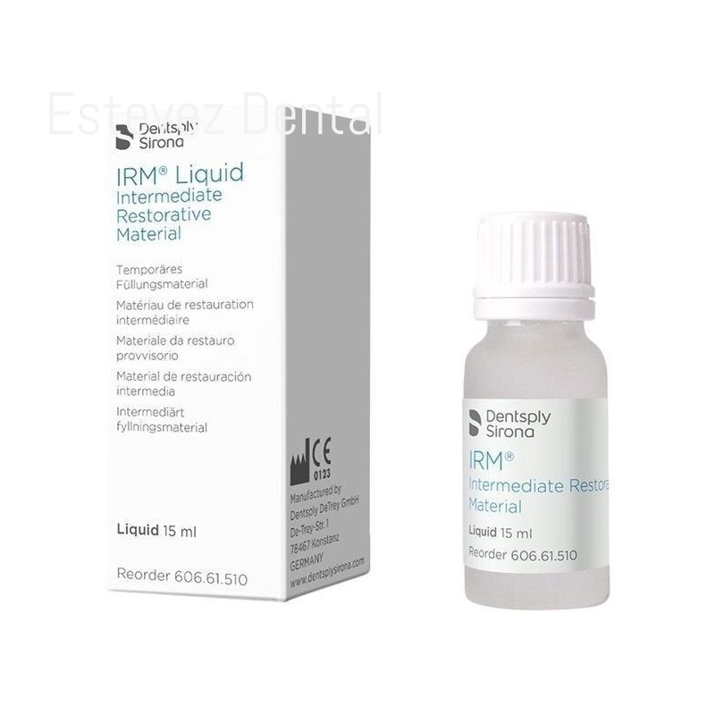 IRM LIQUIDO 15mlCARACTERÍSTICAS: Material restaurador provisional de larga duración a base de óxido de zinc y eugenol, presentado en P/L o cápsulas- Elevada resistencia mecánica: las restauraciones duran un año o más- Compuesto por polímeros reforzados de óxido de zinc-eugenol- Fácil de aplicar, fácil de retirarINDICACIONES- Restauraciones provisionales- Como base debajo de restauraciones que no sean de resina- Restauraciones en dientes temporalesCONTENIDO:- 15 ml líquido