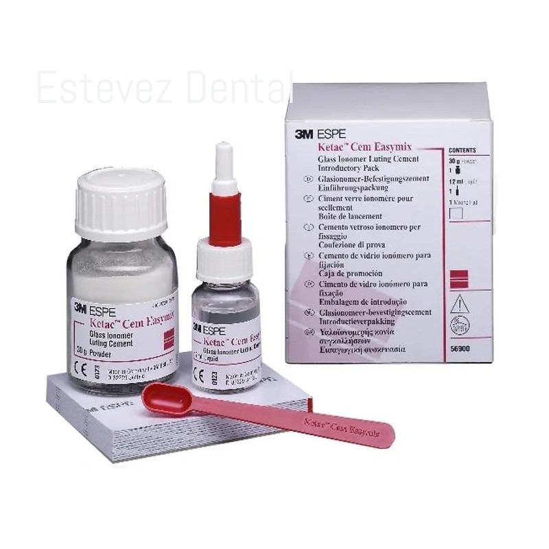 KETAC CEM EASY MIXCARACTERÍSTICAS:- Formulación en gránulos para mezclar manualmente de forma sencilla- Dosis exacta sin polvo residual- Fino espesor de capa- Radiopaco- Liberación de fluoruroUSOS:- Cementación permanente de inlays, onlays, coronas y puentes de Metal o metal-porcelana- Sistemas de alúmina o zircona con muñones reforzados de cerámica (como los puentes y coronas Lava)- Cementación permanente de postes endodónticos y elementos metálicos de ortodoncia- Base cavitariaCONTENIDO:- 1 Bote de 30 gr en polvo- 1 bote de 12 ml líquido