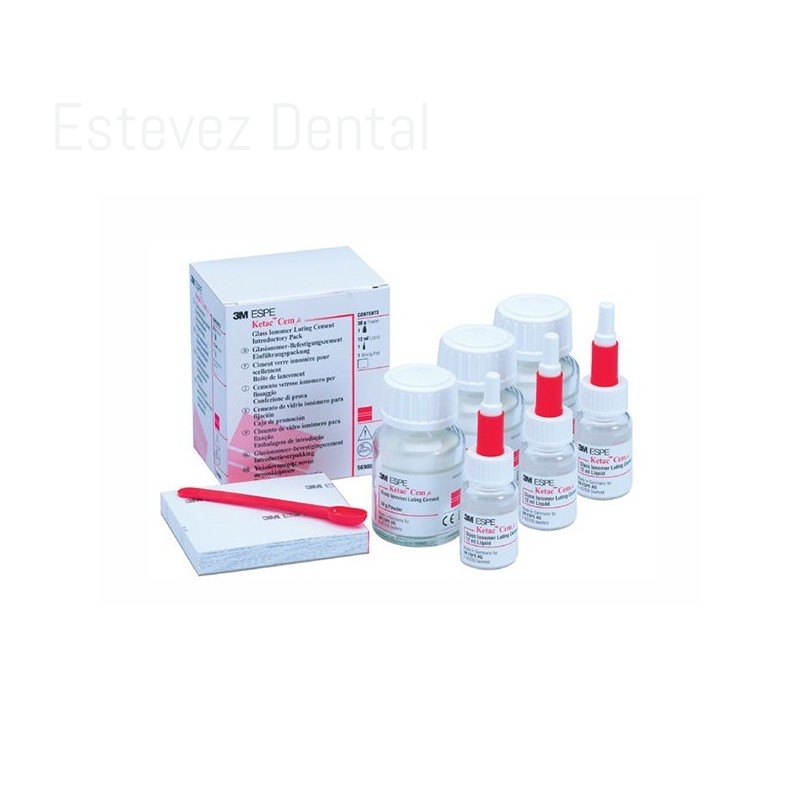 KETAC CEM EASY Mix TripleCARACTERÍSTICAS:- Formulación en gránulos para mezclar manualmente de forma sencilla- Dosis exacta sin polvo residual- Fino espesor de capa- Radiopaco- Liberación de fluoruroUSOS:- Cementación permanente de inlays, onlays, coronas y puentes de Metal o metal-porcelana- Sistemas de alúmina o zircona con muñones reforzados de cerámica (como los puentes y coronas Lava)- Cementación permanente de postes endodónticos y elementos metálicos de ortodoncia- Base cavitariaCONTENIDO:- 3 frascos de 30 g de polvo- 3 frascos de 12 ml de líquido- Cuchara- Cuentagotas