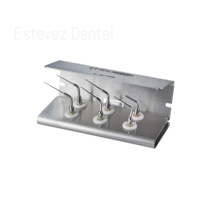 KIT ENDO SUCCESS RETRATAMIENTO 6 PUNTA Insertos (ET18D-ET20-ET25-ET255-ETBD-ETPR) SATELECCARACTERÍSTICAS:- Kit de insertos ultrasónicos para las reintervenciones no quirúrgicas de tratamientos endodónticos- Para retirar precisa y rápidamente un instrumento fracturado en el canal radicular- Extracción con total seguridad un fragmento de espiga o un perno metálico- ET18D: Inserto diamantado de acero de 76 m, longitud de 18 mm y conicidad del 5%. Para: Finalizar la cavidad de acceso y Eliminar protuberancias de dentina, calcificaciones y materiales de relleno- ET20: Inserto de acero, Longitud 20 mm y conicidad del 6%. Para el 1er tercio coronario: Extracción de productos de relleno, conos de plata e instrumentos fracturados y Eliminación de residuos y de la capa de suciedad- ET25: Inserto Longitud 20 mm y conicidad del 3%. Indicado para el retratamiento en los tercios medio y apical para la extracción de instrumentos fracturados- ET255: El inserto corto E