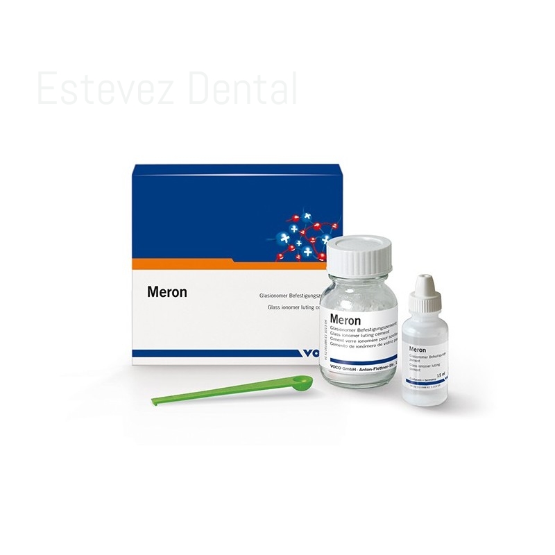 MERON KIT (Polvo + Líquido)Cemento de ionómero de vidrio para fijaciones.CARACTERÍSTICAS:- Baja solubilidad en la boca- Baja acidez- Biocompatibilidad- Simple de usarINDICACIONES:- Cementado de coronas, puentes, inlays, onlays, pins, postes y bandas de ortodonciaCONTENIDO:- 1 Bote Polvo de 35 g- 1 Bote Líquido de 15 ml