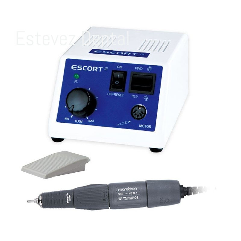 MICROMOTOR ECSORT III + PIEZA DE MANO + PEDALCARACTERÍSTICAS:Micromotor ESCORT III- Micromotor portable y potente de escobillas- Diseño ergonómico de fácil agarre- Adecuado para evitar la fatiga durante el trabajo- Sistema de apagado y encendido directamente en el soportePieza de mano H37L1- Pieza de mano compatible para micromotores con escobillas- Robusta y muy manejable- Diseño ergonómico con mango equilibradoFICHA TÉCNICA:Micromotor ESCORT III- Torque: 4 N/cm- Potencia: 50 W- Velocidad: hasta 35.000 rpm- Peso: 1,25 Kg- Dimensiones: 112 x 147 x 78 mmPieza de mano H37L1- Dimensiones: 152 x 29 mm- Velocidad: hasta 35.000 rpm- Peso: 268 g- Torque: 2,9 N/cm- Con escobillasCONTENIDO:- Micromotor ESCORT III- Pieza de mano H37L1- Pedal regulador on/off