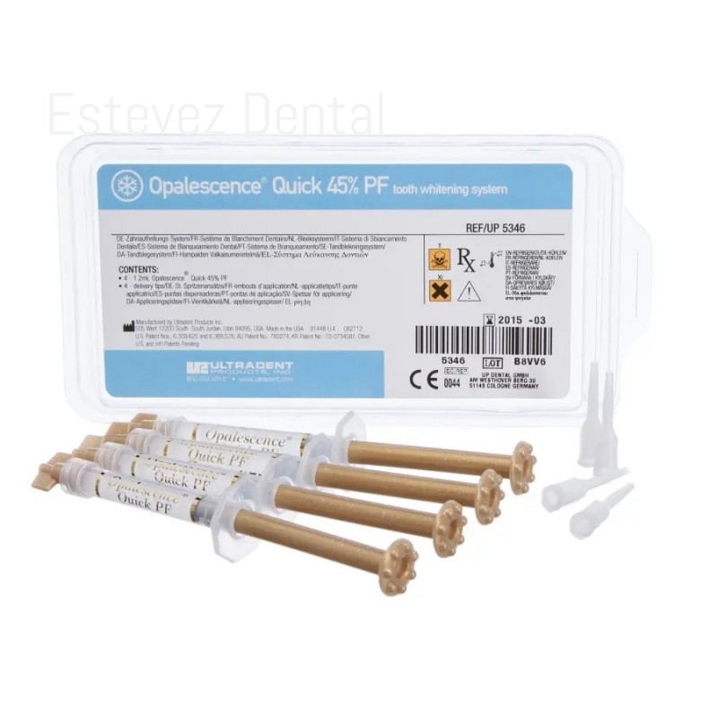 El gel blanqueante dental Opalescence Quick PF contiene PF (nitrato de potasio y flúor)