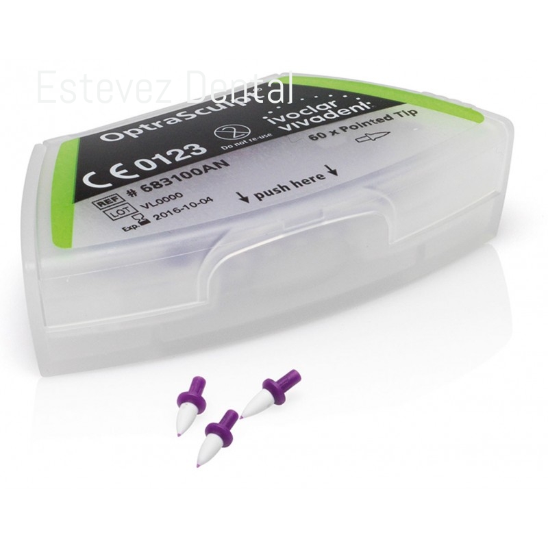 El instrumento puede equiparse con distintas puntas en función de la forma deseada. Las puntas están compuestas por dos materiales que han sido diseñados para facilitar el modelado de restauraciones estéticas con superficies suaves, homogéneas y sin huellas.