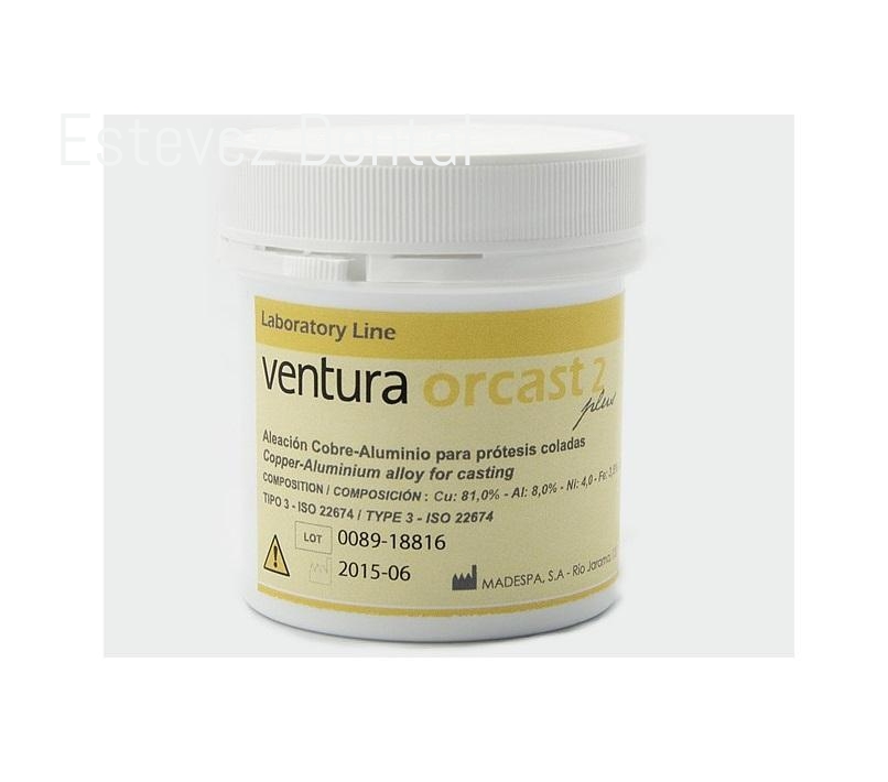 Ventura orcast 2 plus es una aleación de base cobre-aluminio para protesis dentales fijas como coronas y puentes revestidas con resina (acrílicos y composites), coronas e incrustaciones onlays e inlays y pernos muñón.
