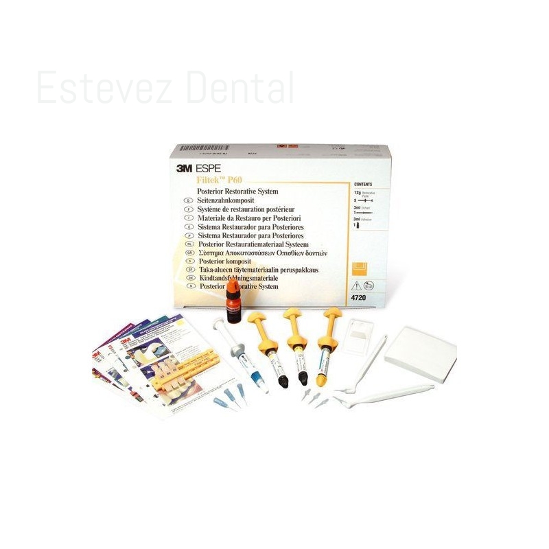 FILTEK P60 KIT RESTAURADOR POSTERIORComposite condensable para restauraciones posteriores.CARACTERÍSTICAS:- Fraguado rápido: solo 20 segundos para fraguar un incremento de 2,5 mm- Baja contracción por polimerizaciónUSOS:- Restauraciones directas clase I y II para posteriores- Técnica sándwich- Reconstrucción de muñonesCONTENIDO:- 3 jeringas de 4 g (A3, B2 y C2)- 1 dhesivo Adper Scotchbond 1XT de 3ml- 1 jeringa grabador Scotchbond de 3ml- Accesorios- Guía de color