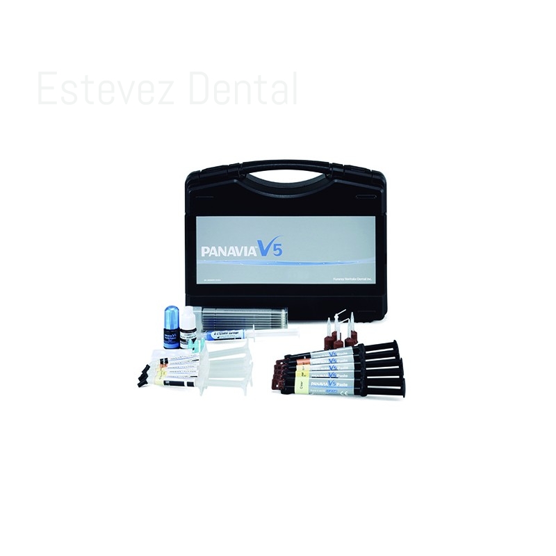 PANAVIA V5 KIT PROFESIONALCARACTERÍSTICAS: - Cemento de composite- Cementación de coronas y puentes- Inlays y Onlays- Cementación de carillas- Férulas- Cementación de restauraciones protésicas sobre pilares de implantes- Cementación de postes y muñones- Aplicación Automix- Espesor del film bajo- Fácil eliminación de exceso de cemento- Punta Endo mejorada para facilitar el acceso root canal- Alta fuerza en unión- Alta estabilidad mecánica- Liberación de flúorFICHA TÉCNICA:- Carga de relleno: peso 61% (38% volumen)- Módulo de fuerza: 27 MPa- Módulo de flexión: 6,3 GPa- Resistencia a la compresión: 310 MPa- Sorción de agua: 21 ug/ mm 3- Espesor de la película 12 micras- Radioopacidad: 180% AL- Liberación de flúor /28 días): 58 ug / g Tiempo de trabajo: 2 minCONTENIDO: - 5 jeringas de 2.4 ml (Universal (A2) clear marrón (A4) blanco y opaco)- 5 botes de pasta Try-in de 1.8 ml (Universal (A2) Clear marrón (A4) blanco y opaco)- Tooth Primer 2 ml- Cleraf