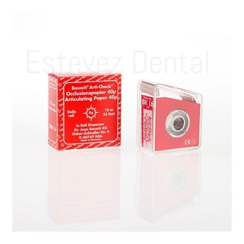 Los papeles de articular Bausch Arti-Check® ultradelgados de 40µ son papeles extremadamente delgados y resistentes al rompimiento que están cubiertos por ambos lados de colores líquidos. Estos papeles tienen una propiedad de marcación bastante precisa por su bajo grosor. Así se evitan contactos erróneos o borrosos. El recubrimiento especial con colores líquidos permite una marcación clara de todos los contactos oclusales o interferencias. Tampoco se presenta ningún problema con las superficies oclusales difíciles de controlar e impregnadas de saliva como por ejemplo oro, cerámica, superficies metálicas pulidas o acrílicos. El recubrimiento de color especial con colores líquidos consta de muchas pequeñas microcápsulas rellenas de color. Incluso con presión masticatoria leve se revientan estas cápsulas y liberan el color, claramente visible. Una marcación repetida es posible porque el color se regenera. Los papeles de oclusión ultradelgados Bausch son especialmente apropiados para la visualización de la oclusión estática y dinámica en dos colores. En el primer paso se controlan los contactos céntricos (oclusión estática) en rojo, en el segundo paso los contactos excéntricos (oclusión dinámica) en azul. El orden de los colores por supuesto se puede cambiar. ?Los papeles de articular Bausch Arti-Check® ultradelgados de 40µ son papeles extremadamente delgados y resistentes al rompimiento que están cubiertos por ambos lados de colores líquidos. Así se evitan contactos erróneos o borrosos. Estos papeles también se ofrecen en forma de herradura. El papel precortado se deja colocar fácilmente sin pinzas ni aditamentos de mordida. Todos los papeles en forma de herradura se entregan en dispensadores plásticos, los cuales permiten un fácil retiro con una mano. Debido a la forma de este papel, todos los contactos dentarios de la arcada dental completa se pueden mostrar con una hoja. Especialmente en prótesis completas o al ajustar férulas de mordida, esto es indispensable.
