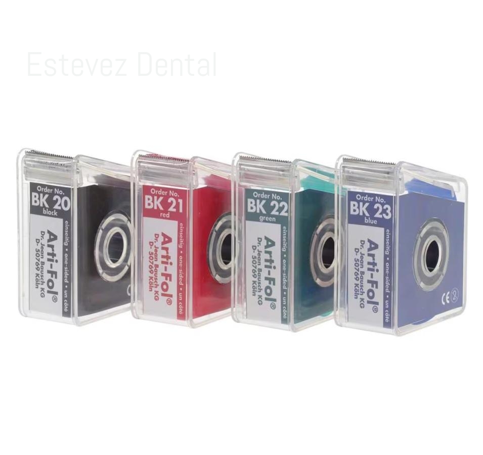 Los folios de articular Arti-Fol® Bausch son especialmente apropiados para la visualización de la oclusión estática y dinámica en varios colores. En el primer paso se controlan la oclusión estática en rojo, en el segundo paso la oclusión dinámica en negro. El orden de los colores también se puede cambiar. Para una representación más precisa de la oclusión dinámica también se pueden utilizar varios colores. Bausch Arti-Fol® se suministra en cuatro colores diferentes.