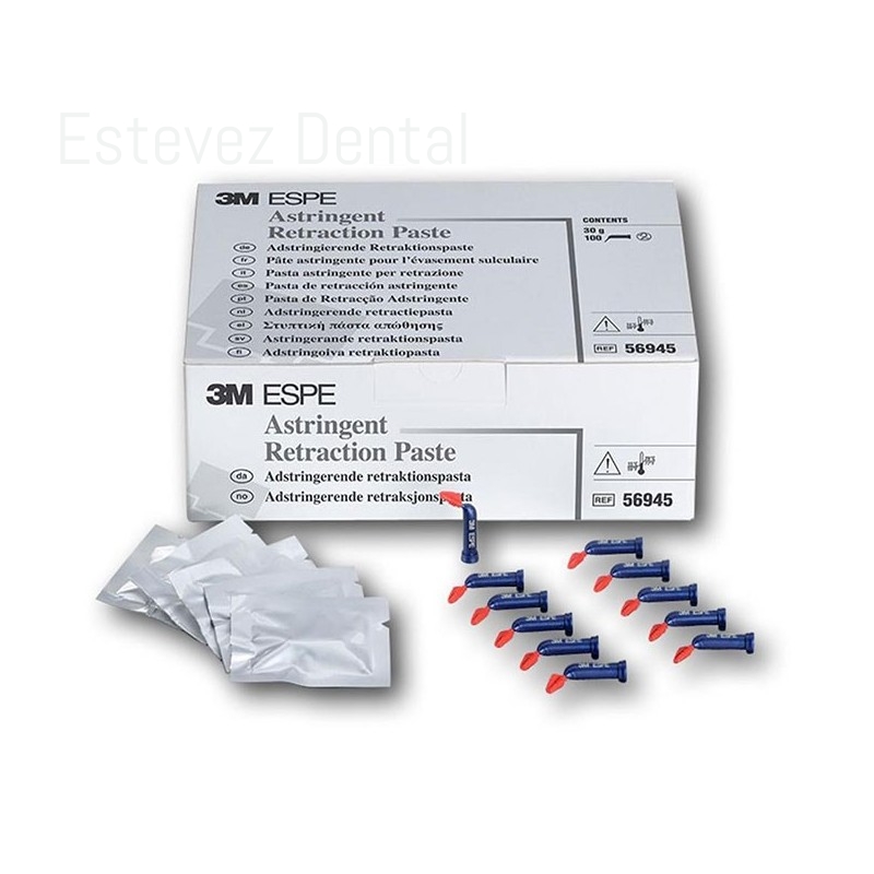 PASTA RETRACCIÓN ARP 100 UnidadesCARACTERÍSTICAS:- Fácil acceso al surco y eficaz apertura gracias a la fina punta de la cápsula- Separación gingival eficaz, zona del surco limpia y seca junto a una hemostasia duradera y estable- Procedimiento cómodo que ahorra tiempo: 50% más rápido que usando hilos- Compatible con la mayoría de los aplicadores de amalgama- Aplicación más higiénica, que evita problemas causados por la contaminación cruzada (monodosis)APLICACIONES RECOMENDADAS:- La pasta de retracción gingival astringente de 3M ESPE, está indicada- Toma de impresiones (sobre sustrato material o digital)- Preparación de colados temporales- Preparación de empastes de clase II y VCONTENIDO:- 100 Cápsulas de 0,2g/Ud