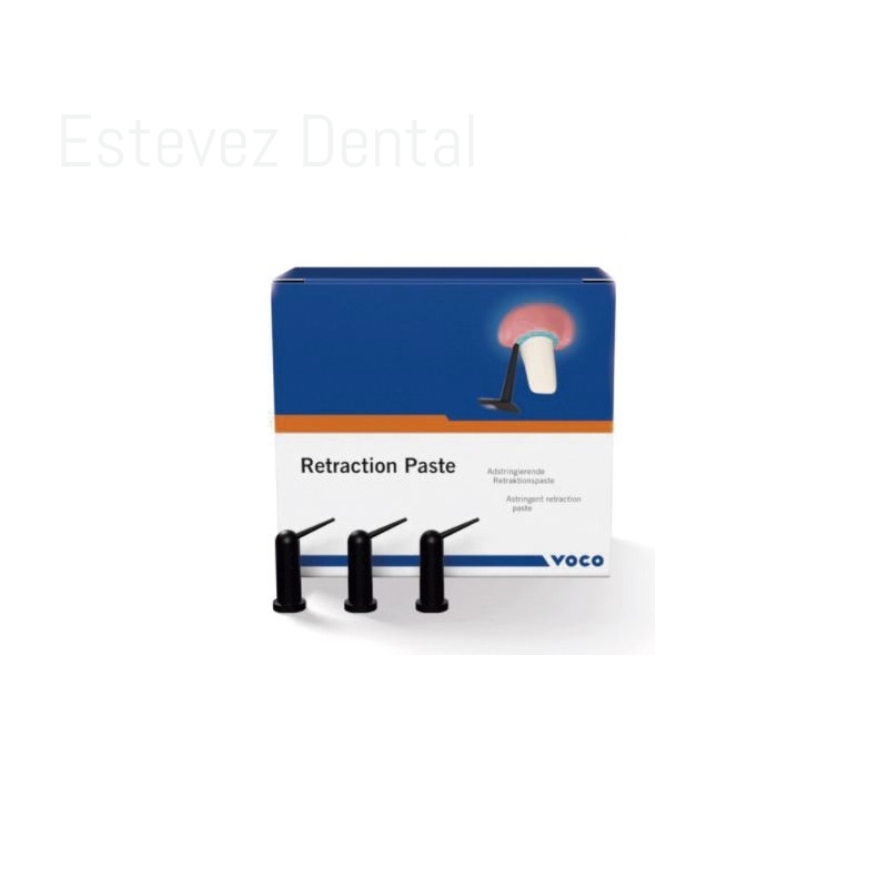 VOCO RETRACTION PASTE CAPS 100 x 0,3 gCARACTERÍSTICAS:- Se aplica directamente desde la cápsula en el surco- Apertura provisional efectiva y el secado del surco que constituye el complemento ideal para el material para impresión de precisión V-Posil- Proporciona la condición previa para la toma de impresión de precisión clásica o digital, así como la preparación cavitaria en obturaciones de clase II y V, pero también para la cementación definitiva y provisional de restauraciones- El tono ofrece un buen contraste con la encía, lo que facilita especialmente el trabajo en las áreas más difíciles de ver- Gracias a la cánula estrecha y ligeramente flexible, el material puede dosificarse y aplicarse con exactitud- La pasta se extrae fácilmente de la cápsula y destaca por su excelente viscosidad de flujo, a la vez que proporciona estabilidad para la apertura del surco- Durante la aplicación, esta pasta con efecto astringente y que contiene cloruro de aluminio obtura