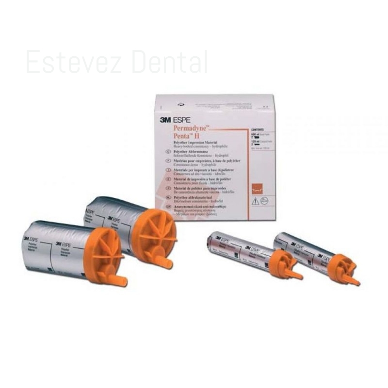 PERMADYNE PENTA HCARACTERÍSTICAS:- Mezcla automática y dispensa con la unidad de mezcla automática Pentamix 3 o Pentamix 2- Para impresiones de una precisión implacable gracias a las convincentes propiedades del poliéter:- Hidrofilicidad inicial: hidrofílico cuando de verdad importa- Tixotropía y excelentes propiedades del flujo, durante todo el tiempo de trabajo- Comportamiento de asentado instantáneo que garantiza unas propiedades del flujo constantes durante el período de trabajo y menos distorsionesCONTENIDO:- 2 pastas base de 300 ml cada una- 2 catalizadores de 60 ml cada uno