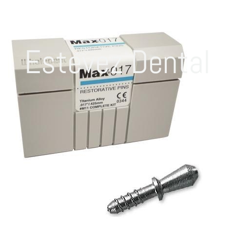 Pins de retención parapulpares de auto roscado con tope de hombro y diseño del cabezal redondeado para una buena adaptación. Aleación de titanio sin corrosión. Autoalineación durante la colocación.