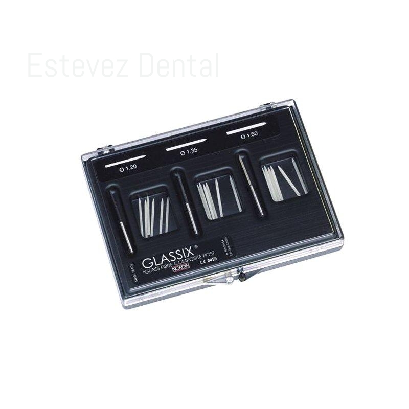 Postes Glassix de composite con fibra de vidrio y radiopacos. Constituidos por haces fuertes y elásticos de fibra de vidrio, trenzados y aglomerados con composite. La fibra de vidrio previene la fractura del poste, haciéndolo muy elástico y, contrariamente a los postes metálicos duros y rígidos, no trasmite tensiones y golpes a la dentina. Actúa junto a la dentina absorbiendo cualquier tensión pues presenta aproximadamente la misma elasticidad que ésta. El composite establece una unión con el cemento de resina y el composite utilizado para la reconstrucción del muñón. La característica especial de Glassix es su color de diente estéticamente agradable que hace que al poste integrarse en la restauración de composite sin transparentar. Los postes están disponibles en tres diámetros, en forma cilíndrica con una ligera conicidad en la punta, ideal para el conducto radicular y que coincide con los taladros calibrados. Los postes Glassix son largos y fáciles de cortar para ajustar a la longitud necesaria. Se suministran en estuche con 18 unidades, 6 por cada medida, y 3 taladros o en cajas de 6 unidades de cada tamaño.