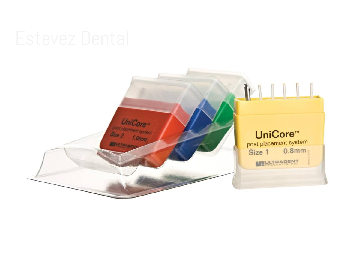 Los postes UniCore están compuestos de fibras de vidrio. El UniCore Post translúcido y radiopaco responde a las fuerzas de compresión como lo haría la dentina, sin comprometer la durabilidad de la restauración. La forma cónica suave del UniCore Post corresponde a la anatomía natural del diente y se adapta perfectamente al espacio del poste creado por el UniCore Drill. Los cinco tamaños y colores de los postes UniCore se corresponden con los del taladro UniCore. El UniCore Drill es único en su capacidad para quitar los obturadores mientras prepara una cámara de postes que se corresponde perfectamente con su poste. El UniCore Drill cuenta con una punta generadora de calor patentada, que facilita la remoción de postes de fibra, soportes rígidos y gutapercha tradicional. Su cuello recubierto de diamante que disipa el calor preserva la estructura del diente, y sus ranuras especialmente diseñadas cortan las paredes del canal lateralmente en lugar de verticalmente.