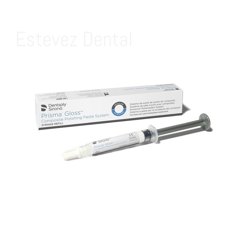 PRISMA GLOSS REGULAR 4 gCARACTERÍSTICAS:- Las pastas de pulido compuestas Prisma Gloss son pastas de óxido de aluminio solubles en agua diseñadas para el pulido final de restauraciones compuestas anteriores y posteriores, cierres de diastema, alargamientos incisales estéticos o carillas- Cuando se aplica con la Copa de pulido de espuma, la pasta de pulido brillante Prisma mejora la suavidad de la superficie acabada de los compuestos de microfil a una superficie final de alto brillo, o prepulidos alisando las superficies terminadas de los compuestos híbridos y microhíbridos a un bajo brilloUSOS:- Pulido final de materiales restauradores de resinas compuestas anteriores y posteriores directas o indirectasCONTENIDO:- 1 Jeringa de 4g