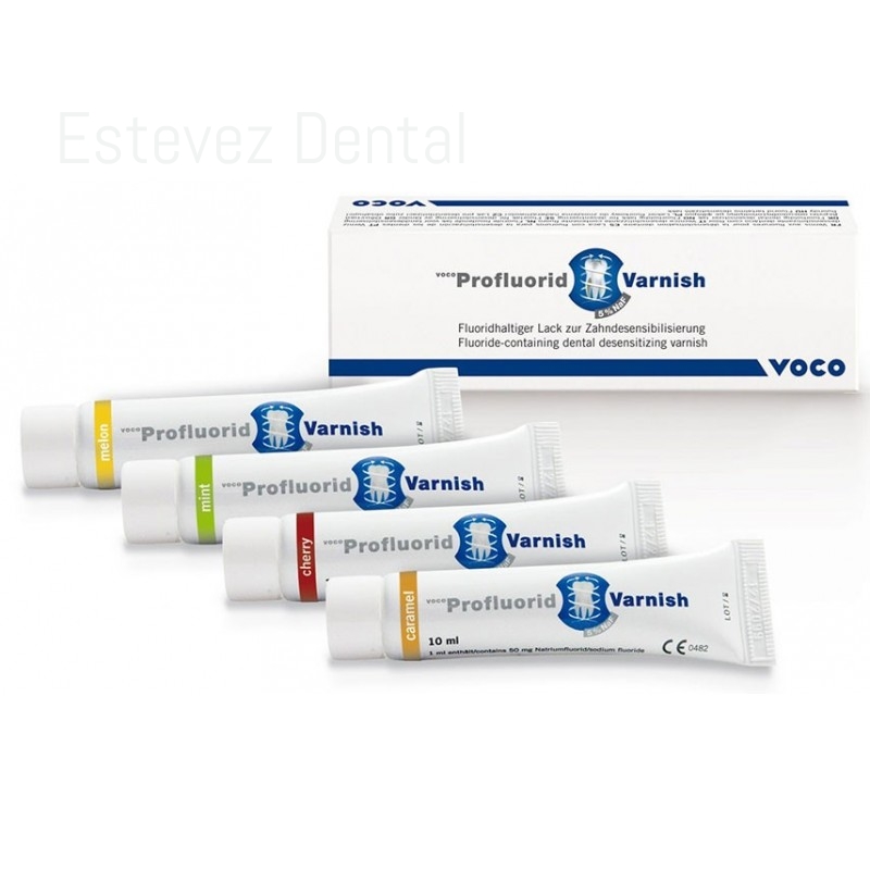 PROFLUORID VARNISH Tubo 4 x 10 ml SURTIDOLaca con fluoruros para la desensibilización de los dientes (NaF al 5 %)CARACTERÍSTICAS:- Tolerante a la humedad Laca estética y del color del diente- Desensibilización rápida y liberación de fluoruro (5 % NaF ? 22.600 ppm fluoruro)- Aplicación económica en capas finas, productivo- Ideal para el tratamiento de los cuellos sensibles del diente después de la profilaxis y la eliminación del cálculo dentalINDICACIONES:- Tratamiento de dientes hipersensibles- Sellado de túbulos dentinarios, p. ej. después de preparaciones de cavidad o en cuellos de dientes sensiblesCONTENIDO:- Tubo 10 ml. Menta- Tubo 10 ml. Melón- Tubo 10 ml. Cereza- Tubo 10 ml. Caramelo